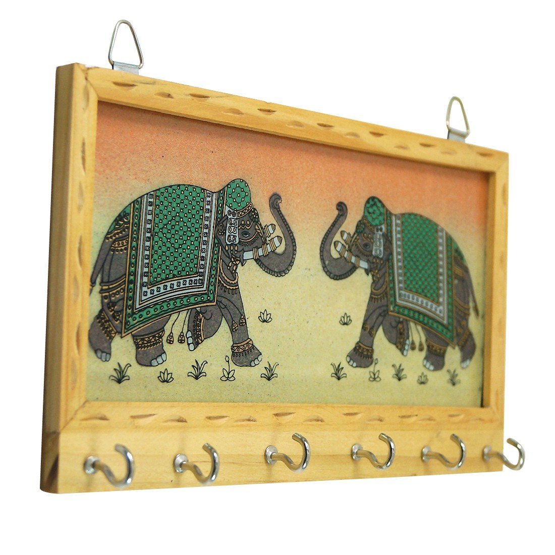 A very unique design of Elephant pair, made with finely crushed real gemstones on a glass base which is a traditional Rajasthani art prepared by the master artisans of Jaipur. The beauty of the unique item is the flawless gemstone painting above the key holding hooks and the neatly carved wooden border.