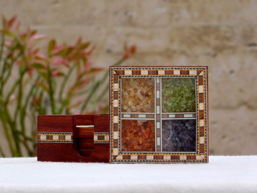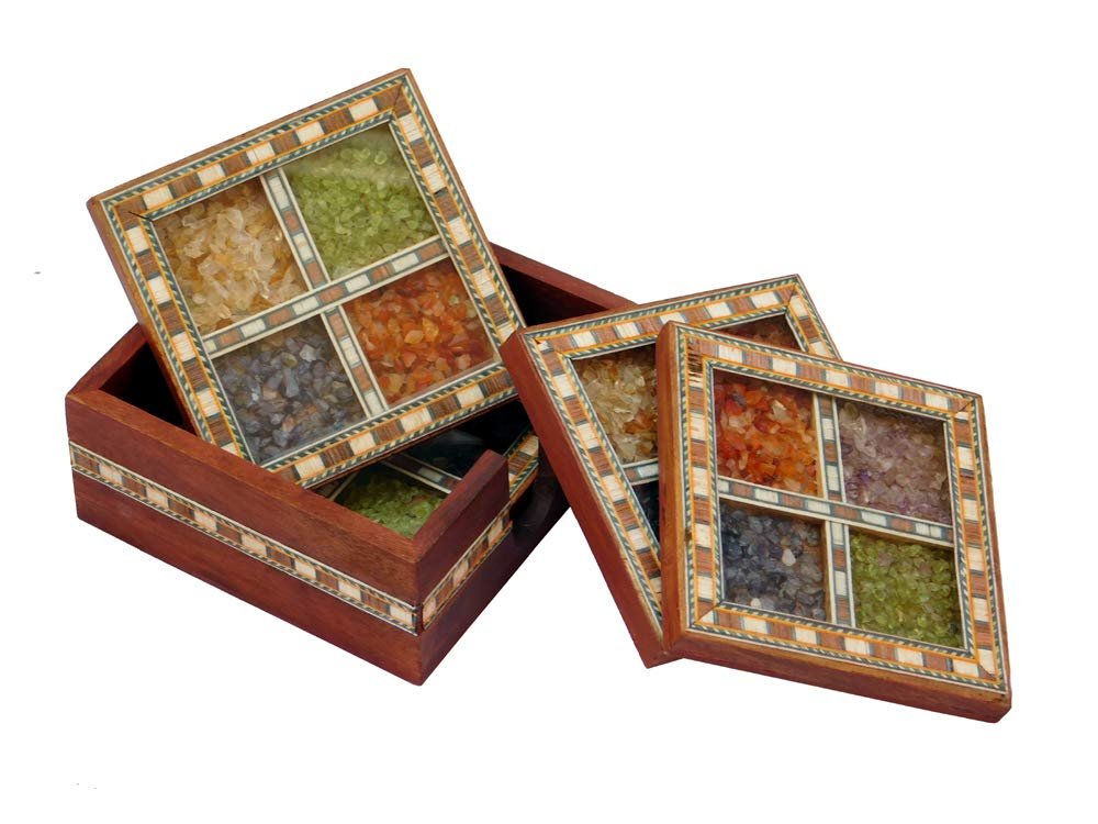 This handcrafted rajasthani gemstone tea coaster set of 4 coasters in square shape is carved out of fine light weight wood and filled with multi colour real gemstones. The set comes with a similarly designed wooden case to keep the coasters. They are polished to give antique royal look. They make for a lovely gifting item too.