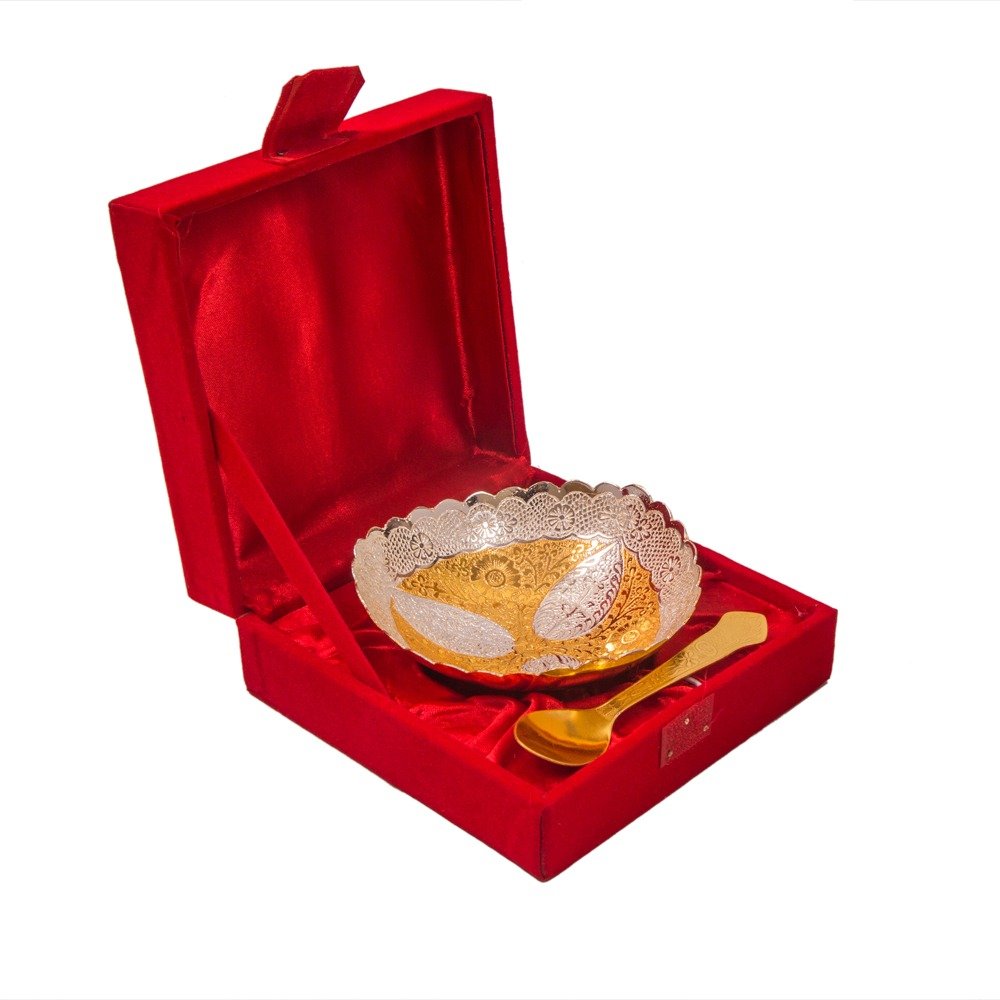 This german silver double tone bowl with spoon set is sure to find the pride of place in the most lavish dining table.The mesmerizing combination of the warm hue of gold with the dazzling aura of silver makes this german silver double tone bowl with spoon set a thing of immense beauty or an ideal german silver gift item. The intricate detailing of the design work present on the dual-toned interior of the bowl makes it beautiful beyond words, while the equally beautiful golden-hued spoon completes the set by enhancing its charm and usability. Therefore, this set is best served by becoming a part of the most sophisticated dining tables.