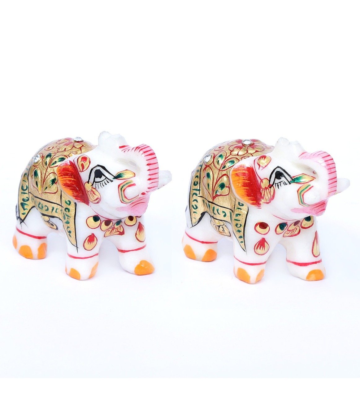 The extensive meenakari beadwork over this entire Rajasthani handicraft of these creatures carved from pure white marble adds to the elegance of the piece.This pair of marble handicrafts elephant showpiece look like having come right from the personal collection of a royal person. The extensive beadwork over the entire body of these creatures carved from pure white marble adds to the elegance of the piece which is further decorated with the dark red and golden colors. Perfect for a showpiece for drawing-room!