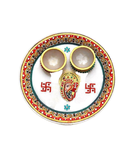 The wonderful product made of Makrana marble is a true piece of skilled craftsmanship. Multi-colored painting and kundans add luster and grace to the piece. A royal touch is added with the use of gold paint. Two holders are placed on the plate which can be used to put Chawal, Kumkum, and Roli This piece holds a great religious significance as Lord Ganesha and Swastik are painted on the thali. This product not only suits personal utility but also works as a wonderful gift to someone to further treasure. Skilled craftsmen have made this scintillating piece of art, but there are possibilities for minor variations in color and contour.