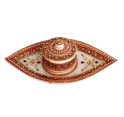 This mesmerizing product from Sanskriti , a  Square Marble Tray with 1 utility container is a perfect addition for gift items category to be considered for dining unit. Aesthetically designed single white marble bowl and Square tray is inlayed with kundan work, white faux crystals and hand painted with gold paint with touches of Red and Green for a graceful look.  Its versatile design, Intricate artistry and superlative craftsmanship makes this ideal for any festive season to grace your table. This marble tray is diligently handcrafted by skilled artisans of Sanskriti  using various traditional techniques. This can be perfact product for gifting purpose.