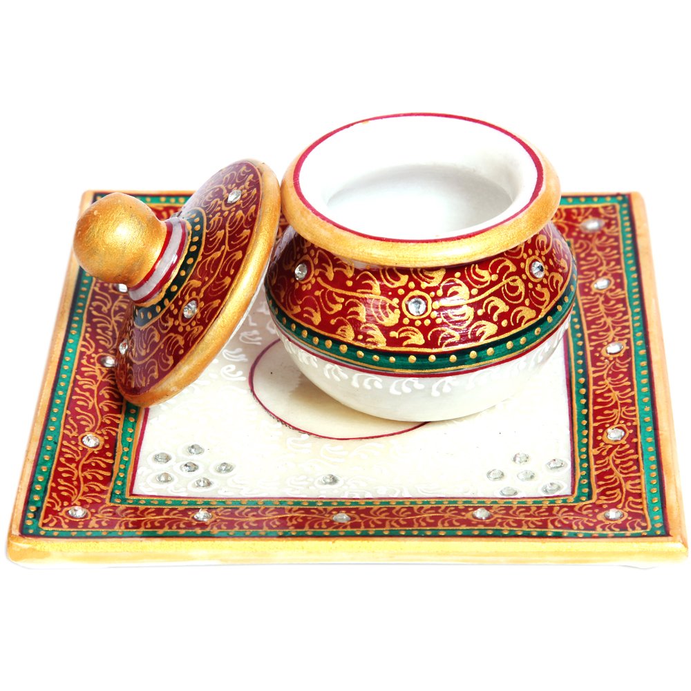 This mesmerizing product from Sanskriti , a  Square Marble Tray with 1 utility container is a perfect addition for gift items category to be considered for dining unit. Aesthetically designed single white marble bowl and Square tray is inlayed with kundan work, white faux crystals and hand painted with gold paint with touches of Red and Green for a graceful look.  Its versatile design, Intricate artistry and superlative craftsmanship makes this ideal for any festive season to grace your table. This marble tray is diligently handcrafted by skilled artisans of Sanskriti  using various traditional techniques. This can be perfact product for gifting purpose.