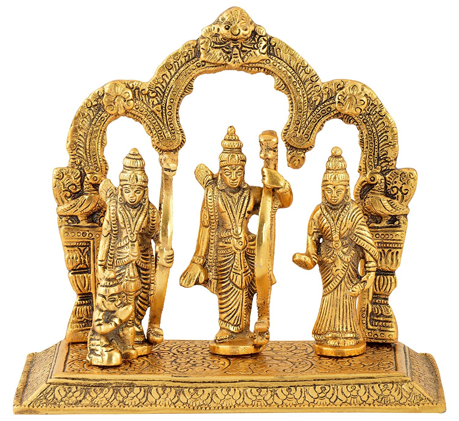 Sanskriti presents you a unique and rare piece of art. The item is made up of brass metal alloy material to make it antique.This statue of Lord Rama will enhance good luck of your home, office etc. This item is made by our artisans who gave it a royal and traditional look. The piece will remain like this and will retain its color. The idol consists of Lord Ram idol along With Goddess Sita ,Lakshman And Hanuman. Best product for gifting purpose on festivals like Ramnavami and Diwali.