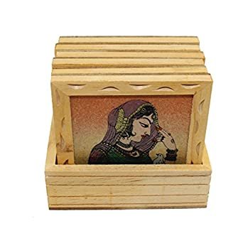 The Beautiful And Traditional Set Of Six Wooden Handcrafted Square Shaped Tea Coasters With Wooden Box Is An Elegant Pick For Home Decor Whether It Is Your Drawing Room Or Dining Space. The Utility Item Is Handmade With Finely Crushed Real Gemstones On A Glass Base By The Master Artisans Of Jaipur.Each coaster of the wooden crafted set has the image of a fine-looking Rajasthani lady adorning its top creating it a good addition on any center table or an ideal corporate or festival gift.
