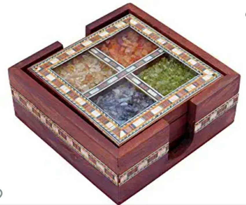 This handcrafted rajasthani gemstone tea coaster set of 4 coasters in square shape is carved out of fine light weight wood and filled with multi colour real gemstones. The set comes with a similarly designed wooden case to keep the coasters. They are polished to give antique royal look. They make for a lovely gifting item too.