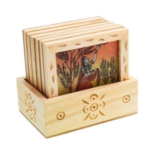 The Beautiful And Traditional Set Of Six Wooden Handcrafted Square Shaped Tea Coasters With Wooden Box Is An Elegant Pick For Home Decor Whether It Is Your Drawing Room Or Dining Space. The Utility Item Is Handmade With Finely Crushed Real Gemstones On A Glass Base By The Master Artisans Of Jaipur.Each coaster of the wooden crafted set has the image of a fine-looking Rajasthani lady adorning its top creating it a good addition on any center table or an ideal corporate or festival gift.